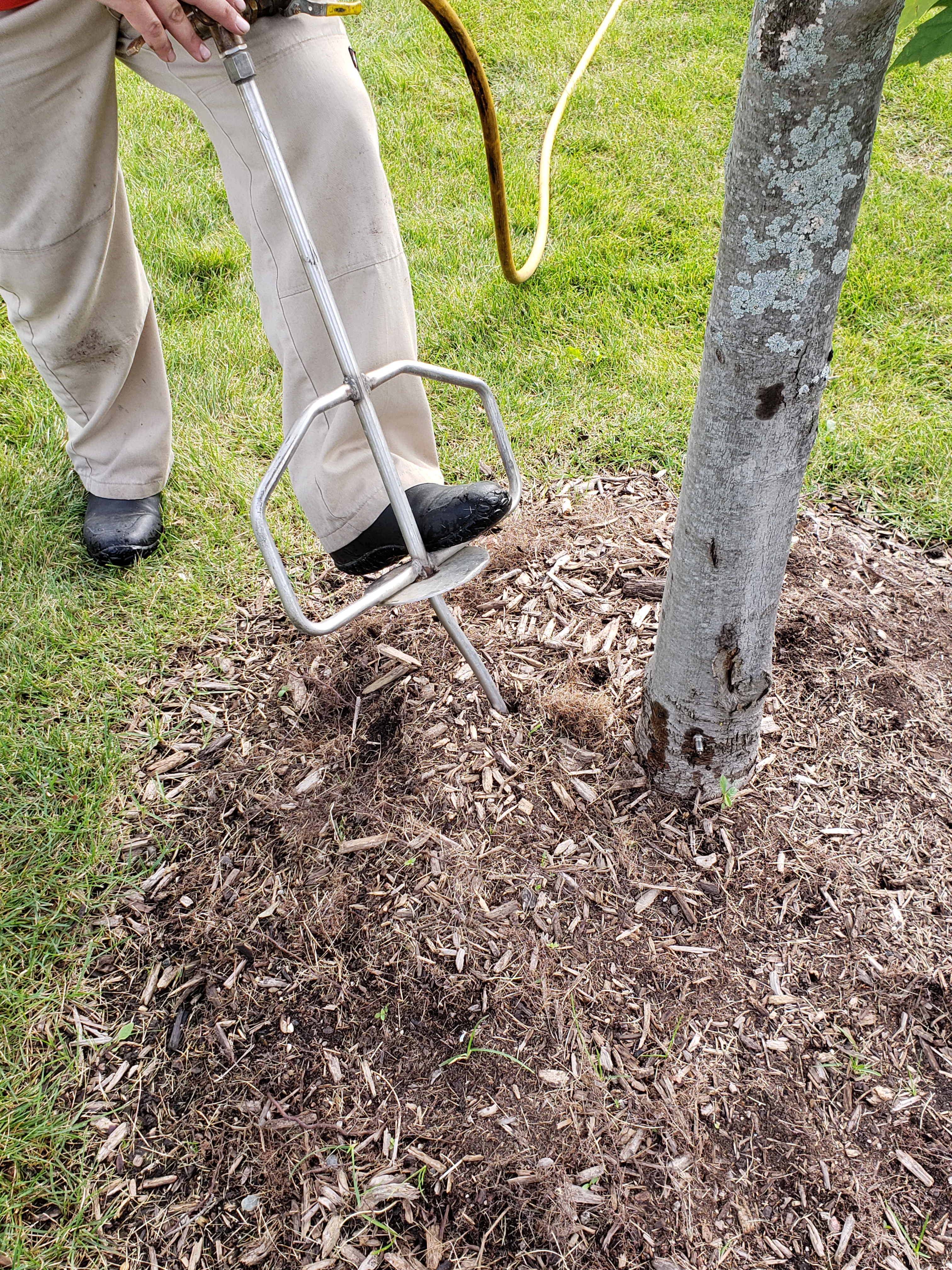 Deep root feeding is a fertilization process that feeds nutrients directly into the roots of a tree or shrub. Instead of simply fertilizing the soil, a large spike is used to inject nutrients directly into a plant’s root ball.